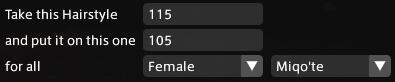 On the mod you want to swap items on, go into Advanced Settings, then Item Swap. For gear, you would choose what item you want to take the look from, and what item you want to put it on. For hair/ears/tail, you would choose the number of tail/ears/hair you want to take it from, and also what you would like to put it on. You also choose what gender and race as well.