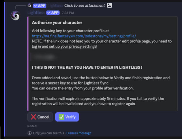The embed from the previous step should update to show a long string of numbers. Where the blurred section is, you will see a code. Copy this string, and put it in your Lodestone Profile.