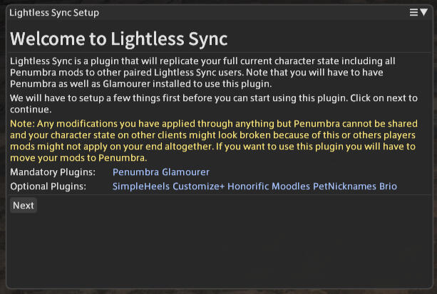 The following plugins also sync with Lightless, and allow you to see a character fully as they wish for you to see them. While they are optional, it is recommended to install them for people that use them.