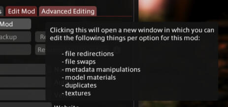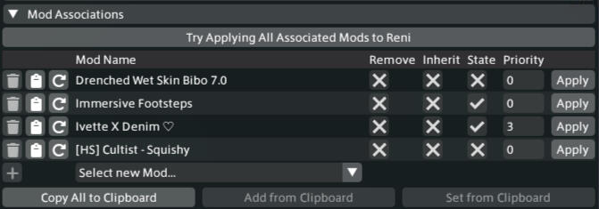 Have you had two mods that conflict with each other, but you use both of them? And moving items around is a pain? Stop moving mods around and just use Mod Associations! With Mod Associations, you can tell Penumbra to use one mod over a different mod, or even change settings on the same mod for different reasons! For example, in the picture below it turns the wet look I use when in my bikini, changes the sound my footsteps make to heels since I wear heels with this look, turns ON the Ivette x Denim mod and turns OFF Cult's Squishy mod! Let's get into how to do this!
