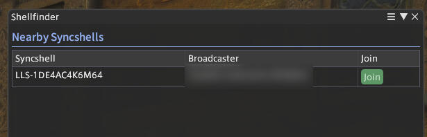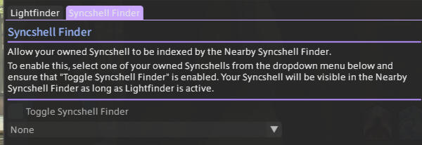 Just like the Lightfinder, if you own a Syncshell, you can choose to broadcast your syncshell and if people want to join it, they can do so by hitting Syncshell Finder right next to the Lightfinder button! Any syncshells in the area will show in the window that will appear. Just click "Join" and follow the prompts!If you want to broadcast your syncshell, click the Lightfinder button, and in the window that pops up, click the Syncshell Finder tab. Choose the syncshell you want to broadcast, and then check the Toggle option above the dropdown! You need Lightfinder enabled in order to broadcast your syncshell in the Syncshell Finder.