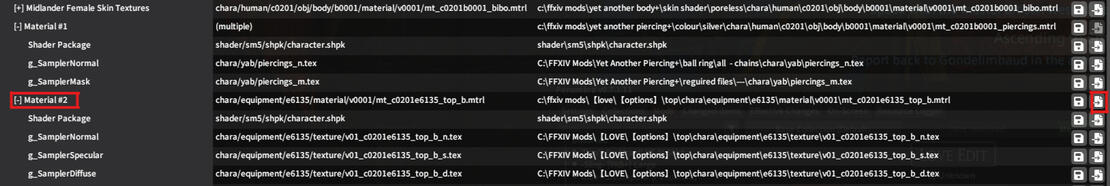 Now that we are on the Import From Screen tab, click the plus next to the modded item to drop down the material list. Please note that the mod in question may have one or multiple layers, so you may need to look further into the layers for more information. You can hit the plus next to each layer and it may provide more information but I can't guarantee it will. As we made a new mod, I would suggest adding all the layers you feel may be relevant and if they aren't, you can just delete that layer.When you know what layers you want to add, click the paper to the right to add a copy of the material to your new mod. For my example, I don't want Material #1 as that is my piercings, and I don't want the skin textures, so I will hit the paper for Material #2.