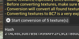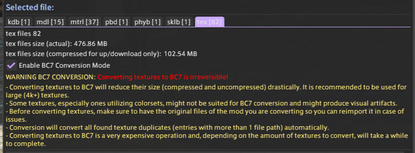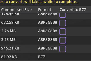 You should see a list of files. These are all the different textures that make up your look. From here, we will click on "Enable BC7 Conversion Mode". This will set a check box next to all of your textures that are not already using BC7 compression. You can click on each texture, decide if you want to compress it, and if you do, hit the check box next to it. Then, hit "Start conversion of (x) texture(s)" to begin letting your textures be compressed. After it finishes, your look should be much lower, making it easier on those around you!