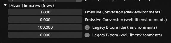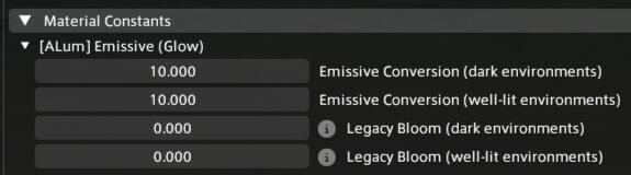 Now that all the texture work has been done and saved, let's go to the Materials tab. You did select it like I asked in the earlier section, right? When you go to the Materials tab, there should be just the one texture in there. Click on it, and drop down the Material Constants section. Depending on what level of ALum you are on, you should see different options to use. For right now, we will stick with Level 2. You should have a section called [ALum] Emissive Glow. Now, depending on how you want to set this up, you will want to play around with different settings for each. For example, if you want to make it so your eyes don't glow when the light hits it, but does glow in shadow, set the well-lit environment options to 0 and the dark environments to the number you would like. I like to set the Emissive Conversion to 1, and the Legacy Bloom to 10, but this is all on you at this point. As long as the mod is active and applied, you can also hit "Reload live preview" to be able to change them on the fly to find a look you like!