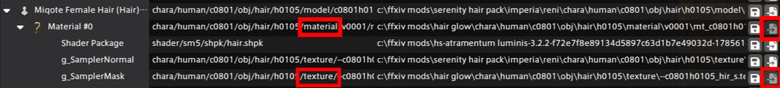So, first we need to make the mod so we can do all we need from there. To do so, like we have done for other things, is to click the + in Penumbra, name it what you want, and then go to Advanced Settings. Make sure you are using the hair you want to make glow, and then go to the Import from Screen tab. Refresh just to make sure it is all the current mods on your character, and then search for your hair. You will need to get the material and the texture for the hair. I have highlighted the ones to download.ALL OF THIS SHOULD BE DONE FROM THE MOD YOU MADE AND NOT YOUR ORIGINAL HAIR MOD.