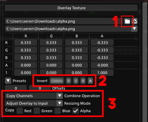Now that we have our glow mask, go back to your game. The Textures tab should still be up, but if it is not, bring it back up and select your original texture again. Now, do not use the normal import button to import your texture back into Penumbra. Instead on the right side of the Textures window, you should see a grey bar and a little carat on it. If you click that, the Overly Texture section pops out. Click the folder on this side, select your alpha texture, choose "Grayscale to Alpha" (either one), click Invert A (not colors), and then change the settings below like I display to the right. After you do that, hit "Save in place", then let's start fine tuning!