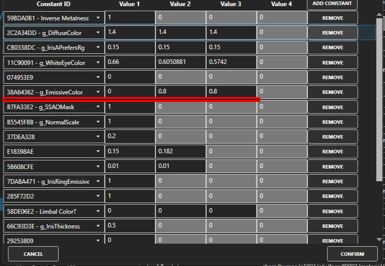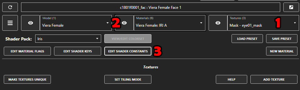 So...now we get into the nitty gritty. This is where you will need to edit values to get the very specific colors you are looking for. Make sure are on the mask texture (1), click the eye on Materials (2), and then click "Edit Shader Constants" (3). Look for the "gEmissiveColor" constant, and change the values as needed. They go in this order: