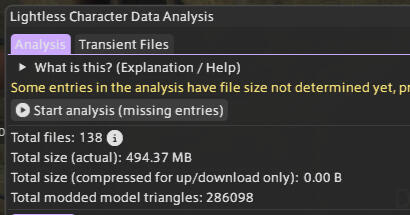 Let's start with how to see your own triangles and VRAM. If you open Lightless, click the person with a cog wheel by them, and click Chara Data Analysis, it will bring up a window. Click "Start analysis" and let it analyze you. It should eventually show you your actual size, as well as the total size when compressed and your modded triangles.