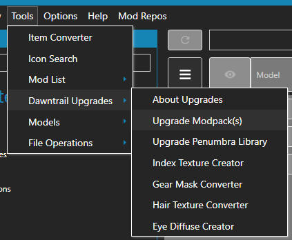 So, select "Tools", then "Dawntrail Upgrades", then Upgrade Modpack(s)" and find the mod file you want to fix. After you upgrade the mod, it will give you a new option with a _dt at the end of the file name. Save this new version of the mod somewhere you will remember!