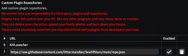 All of the plugins provided in this guide can be downloaded from the same repository. Once you have XIV Launcher installed and have Dalamud enabled, go to Experimental, scroll past the Dev Plugins section and find the Custom Plugin Repositories section.DO NOT PUT THE REPO IN DEV PLUGINSPut this link in the first open field that you have link in the picture.https://raw.githubusercontent.com/Ottermandias/SeaOfStars/main/repo.jsonThis repository will also help you install other plugins used in this guide. It's good to start with Penumbra as other plugins depend on it. Once you have Penumbra set up, installing Glamourer would be the next step as Mare Synchronos requires both to work. From there, you can search for any of the other plugins as desired.