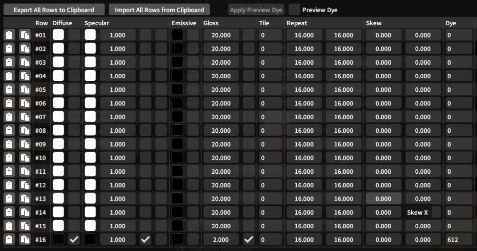 Now, make your edits! Feel free to use the information and resources provided at the beginning of the guide for help in how and what to change. You can edit the Diffuse, Specular, Emissive, Gloss and other more advanced features from here! Make sure to check the Dye column as it may provide some assistance as well. In my example, only one layer is set to something other than 0, so that would be the only layer affected by dyes in game.