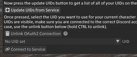 Since we have already set up your account, click "Check if Server supports Discord OAuth2" and wait for it to check. It should come back saying "Server is compatible with Discord OAuth2" so click on "Authenticate with Server" and look for a pop-up window in your browser. Log into Discord, and it will authenticate you! Close the window when it tells you that you can, and then go back to in game. Click on "Update UIDs from Service", then click the UID drop down and select the UID you want to use on the character you are logged in on. Then, just hit "Connect to Service" and you are connected!